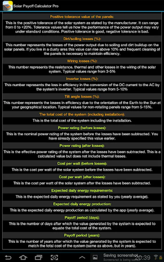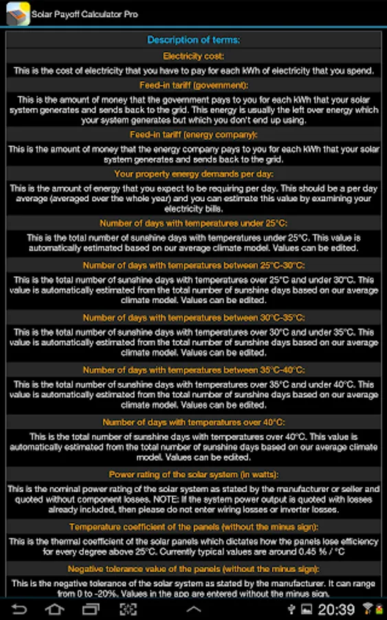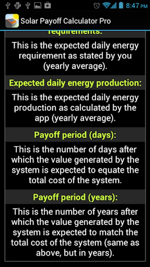 This version of the app (Solar Payoff (payback) Calculator Pro) is for PERSONAL USE ONLY. Business use is prohibited (see below).