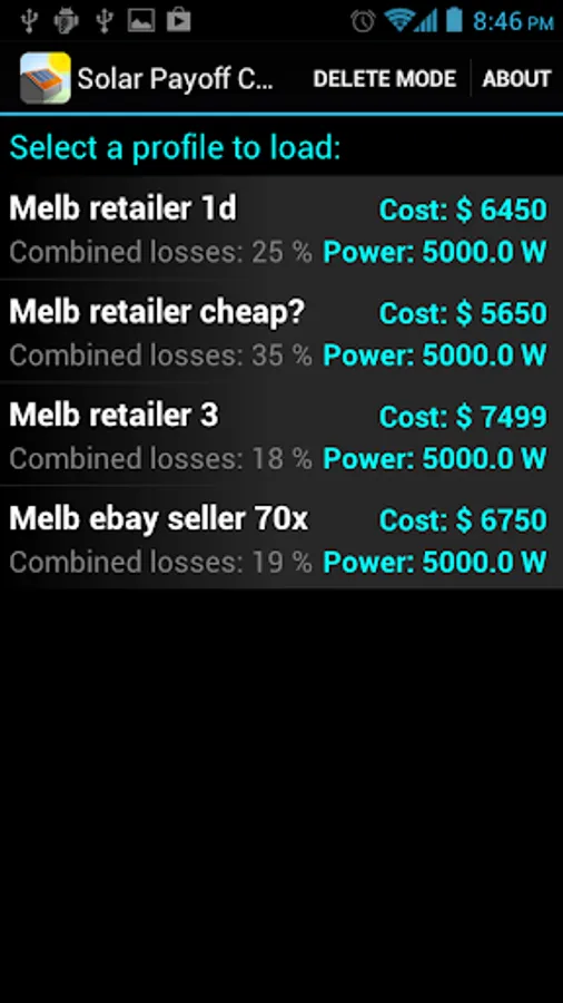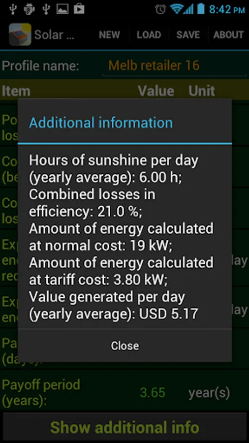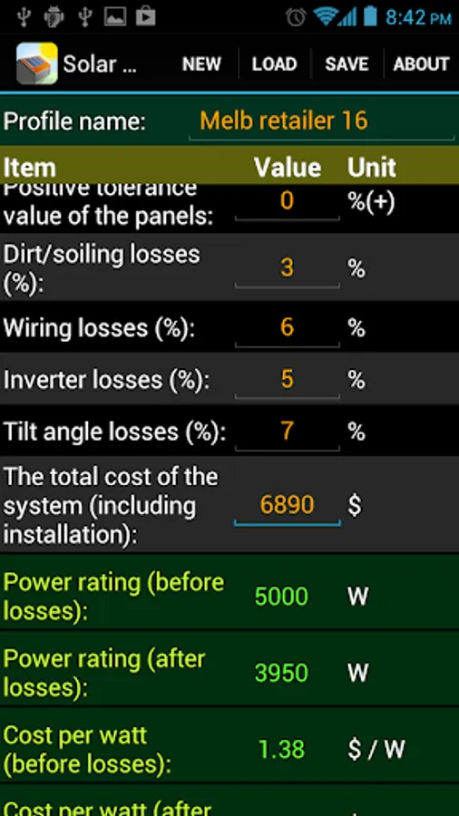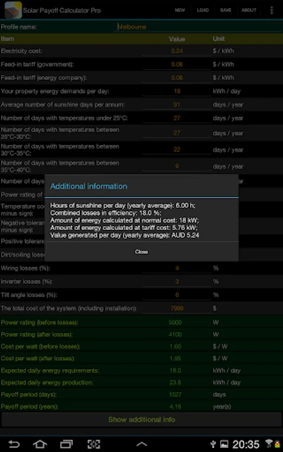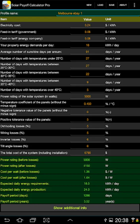 Investing $5,000+ into a solar power system can be a painful task. Which system should you purchase? Which price is better? What effect will an increase in performance of an expensive inverter have over another one? How do you know that you can trust the retailer who is selling you the system? Which solar system is better for your property in terms of its power rating and your energy demands? How much energy is the system expected to make and how long is it going to take for the system to pay itself off with the generated value? These are just some of the questions that Solar Payoff Calculator Pro can assist you with when you are considering to make an investment into a solar power system.