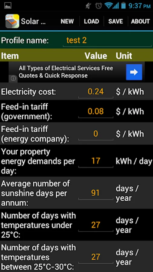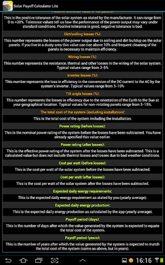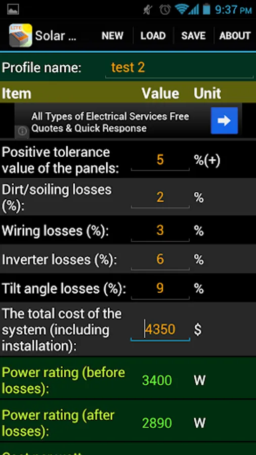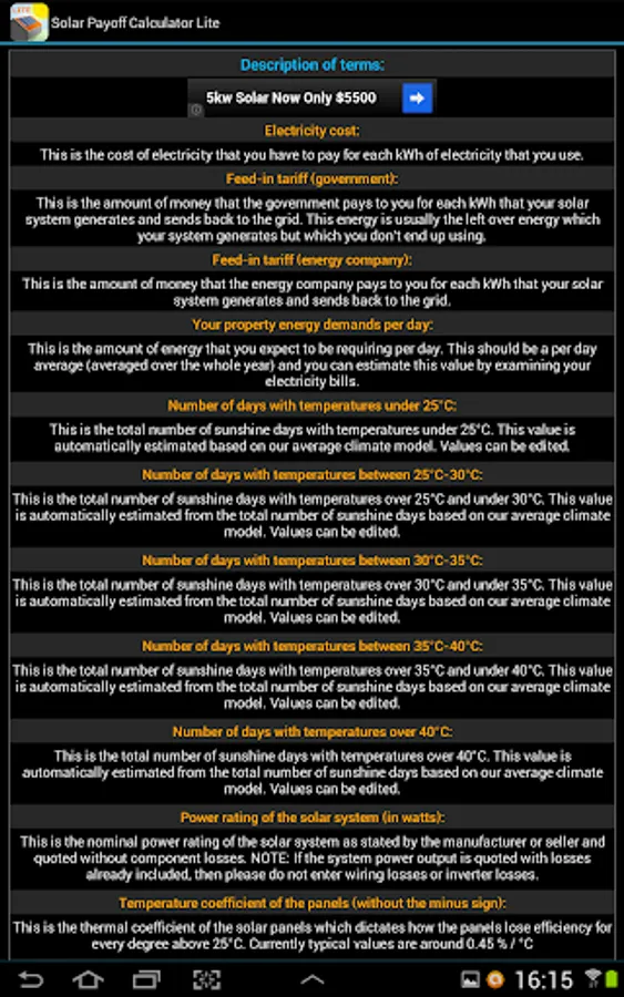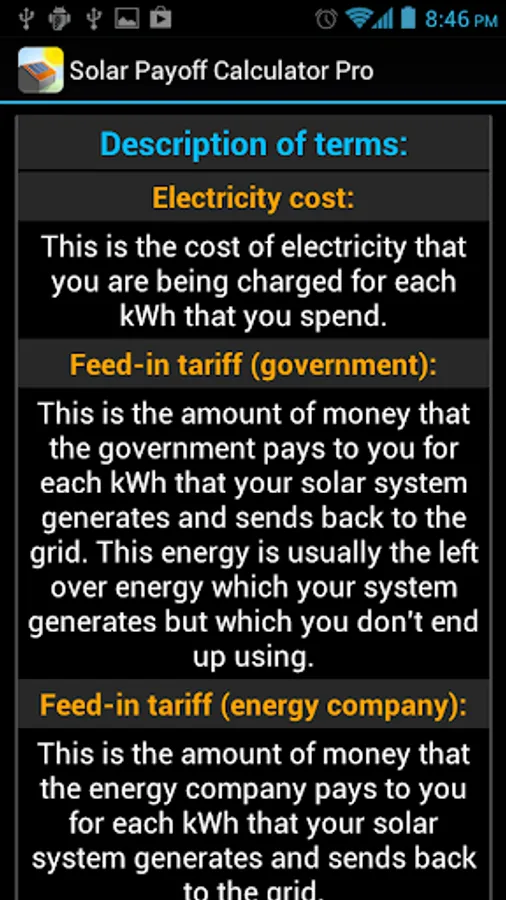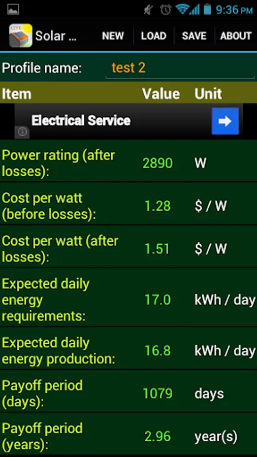 This is the free version of our Solar Payoff Calculator app. It can assist with payoff (payback) calculations for systems up to 4kW. To get rid of ads and the power limitation please consider purchasing the Pro version, thanks.