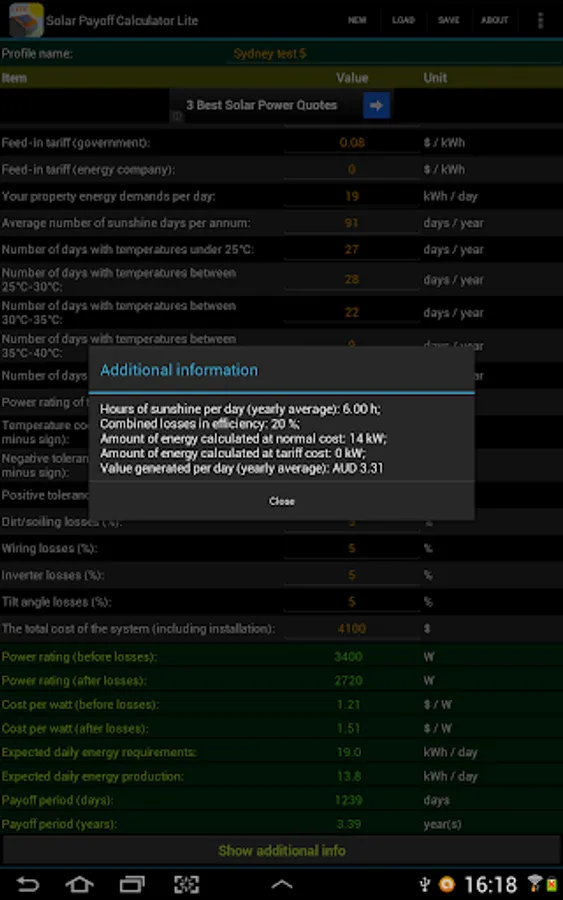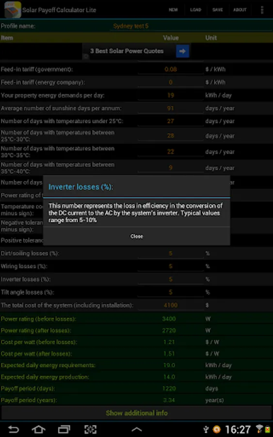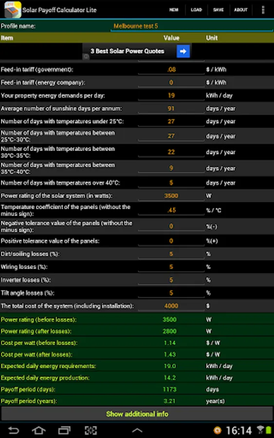 Investing $5,000+ into a solar power system can be a painful task. Which system should you purchase? Which price is better? What effect will an increase in performance of an expensive inverter have over another one? How do you know that you can trust the retailer who is selling you the system? Which solar system is better for your property in terms of its power rating and your energy demands? How much energy is the system expected to make and how long is it going to take for the system to pay itself off with the generated value? These are just some of the questions that Solar Payoff Calculator Pro can assist you with when you are considering to make an investment into a solar power system.