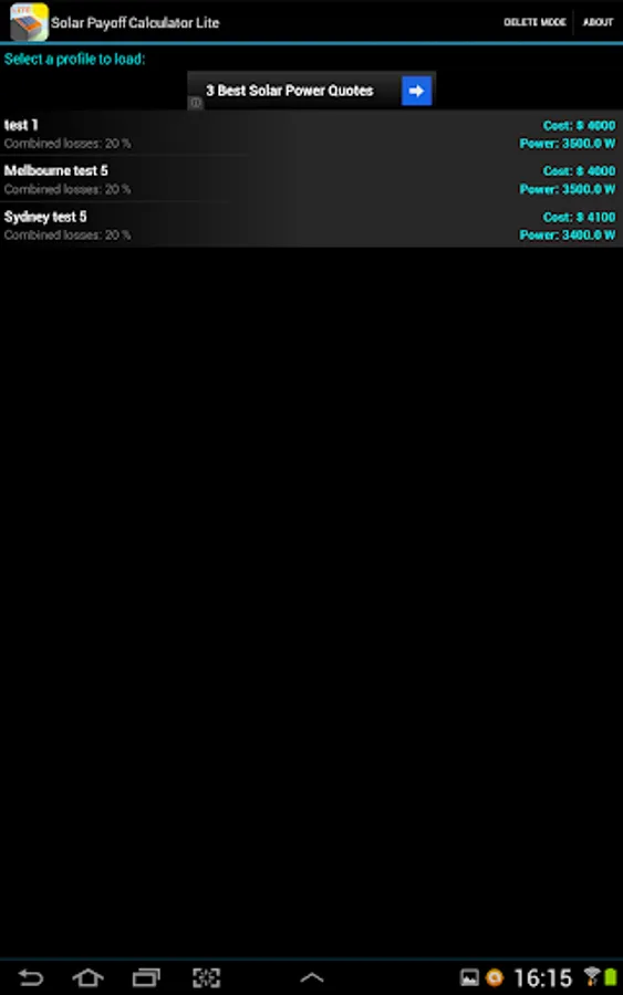 Solar Payoff Calculator was designed to assist buyers with making a decision when buying a solar power system by allowing the buyers to enter researched data about their location, solar system specifics and the price of the system into the calculator, which then makes approximate calculations such as the effective cost per watt, power rating and payoff time. Multiple solar system data can be saved into the database to assist with making comparisons or simply saving the data as you browse the market and inspect different solar power system deals.