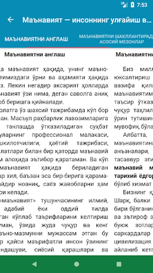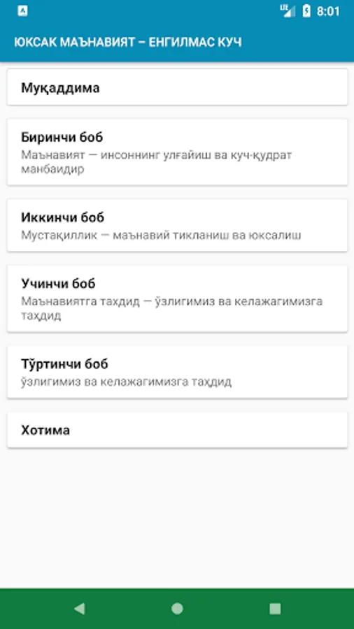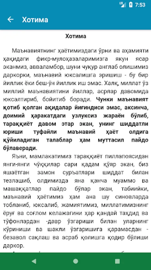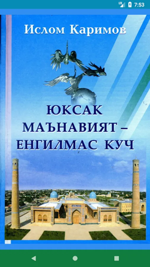 MOBILE oozes ORDAMIDA O'zbekiston RESPUBLIKASINING Birinchi president, BUYUK Davlatov VA Siyosat Arbob Islom ABDUҒANIEVICH KARIMOVNING "YUKSAK Manaviyat - ENGILMAS heaps" ASARLARINI ANDROID operating TIZIMIDA ҚULAY ЎҚISHINGIZ MUMKIN.
