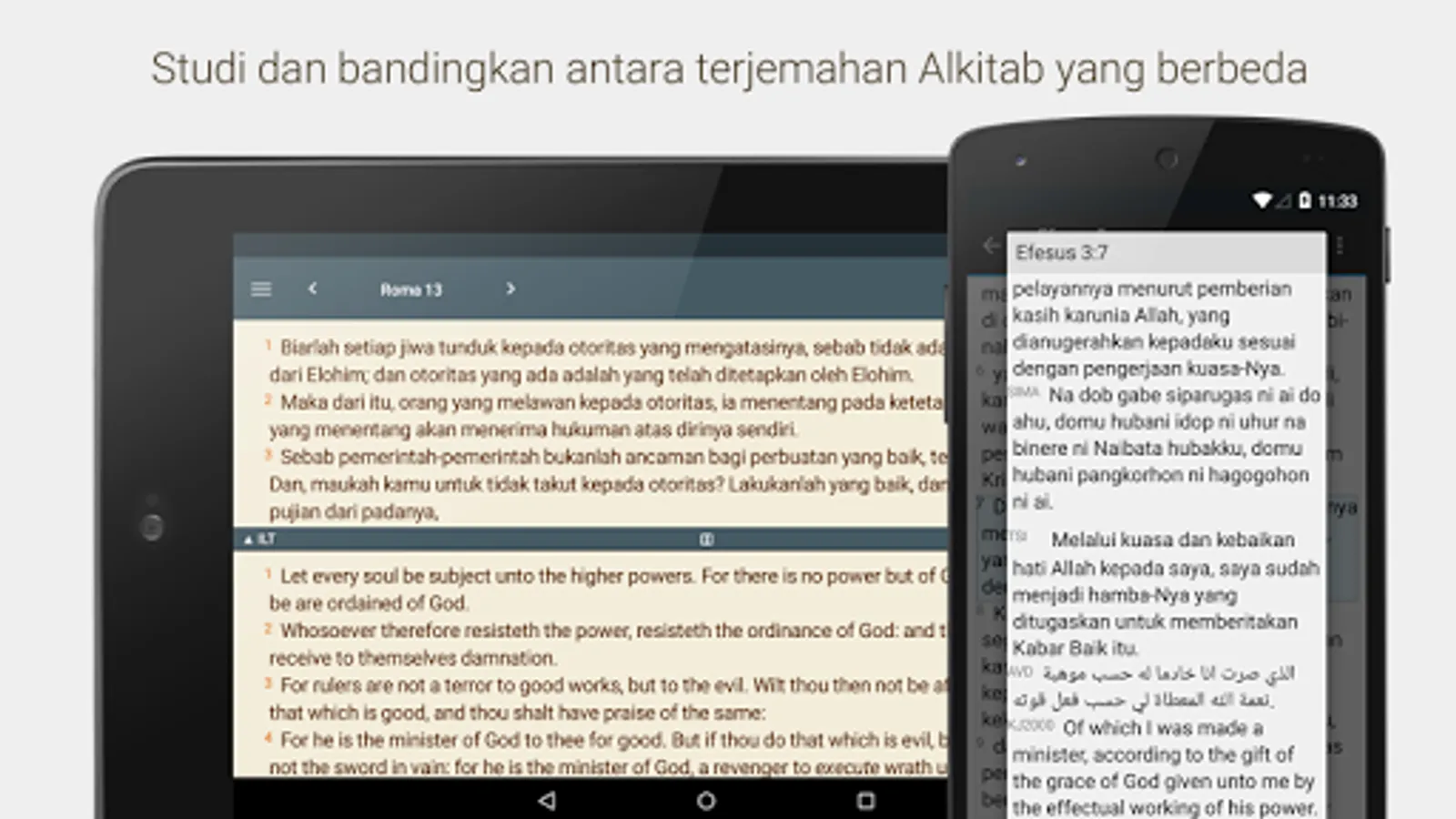 Various translations of the Bible. There are various versions of Bible translations in Indonesian and regional/ethnic languages, the original language of the Bible (Greek/Hebrew), and other foreign languages. It only needs to be downloaded once, after that it can be read offline.