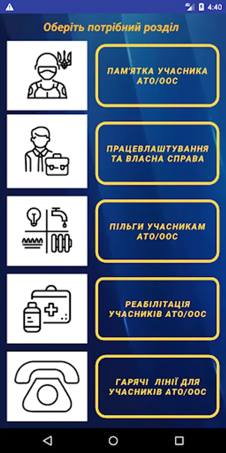 This application is designed to speed up social and professional adaptation of combatants and provide basic information about the benefits, rights and social guarantees, and - providing recommendations on how to proceed in certain situations.