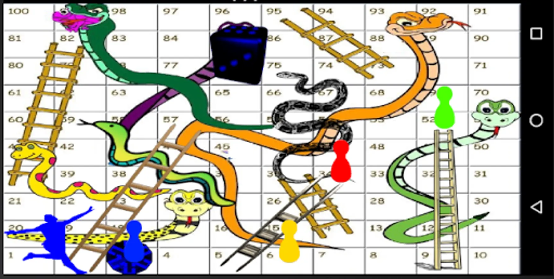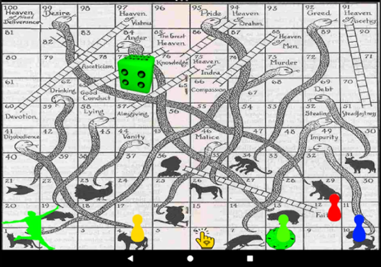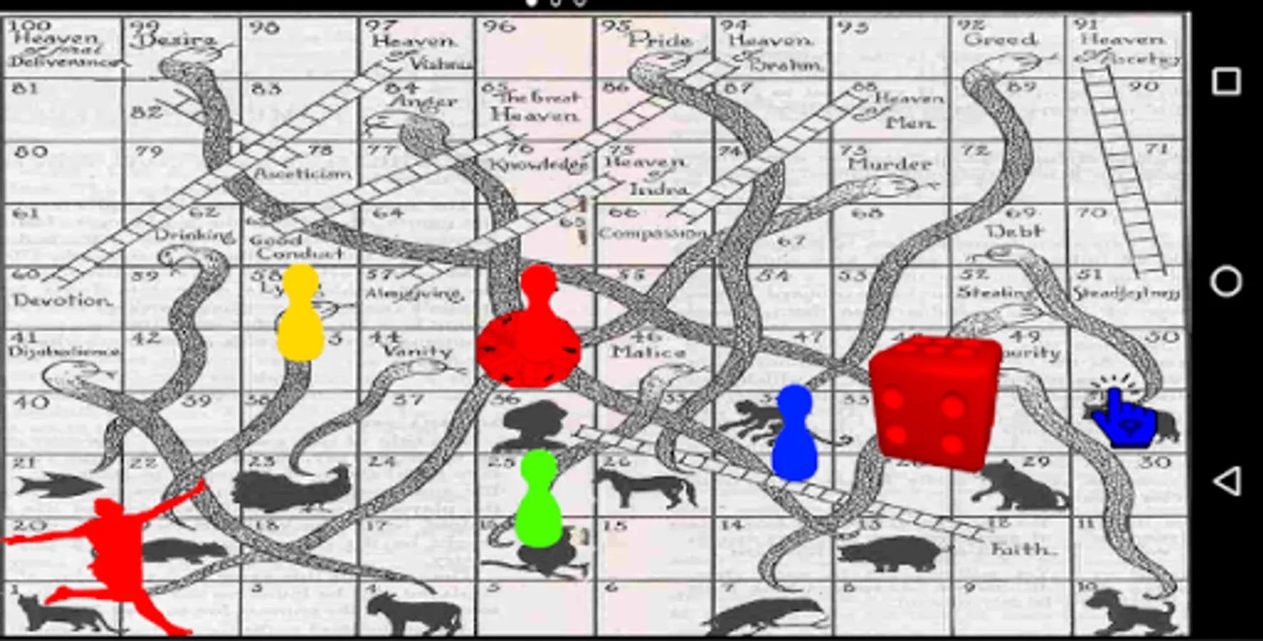 The game was popular in ancient India by the name Moksha Patam. It emphasized destiny, as opposed to games such as pachisi, which focused on life as a mixture of skill (free will) and luck. The game has also been interpreted and used as a tool for teaching the effects of good deeds versus bad. The board was covered with symbolic images, the top featuring gods, angels, and majestic beings, while the rest of the board was covered with pictures of animals, flowers and people.The ladders represented virtues such as generosity, faith, and humility, while the snakes represented vices such as lust, anger, murder, and theft. The morality lesson of the game was that a person can attain salvation (Moksha) through doing good, whereas by doing evil one will inherit rebirth to lower forms of life. The number of ladders was less than the number of snakes as a reminder that a path of good is much more difficult to tread than a path of sins. Presumably, reaching the 100 represented the attainment of Moksha (spiritual liberation).