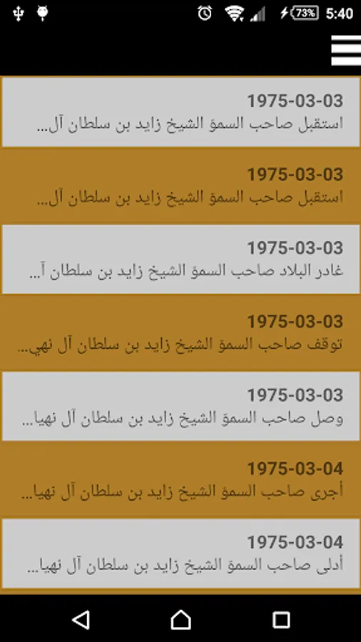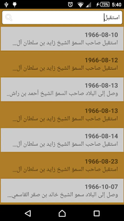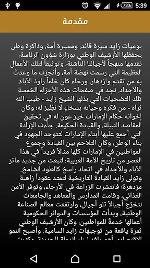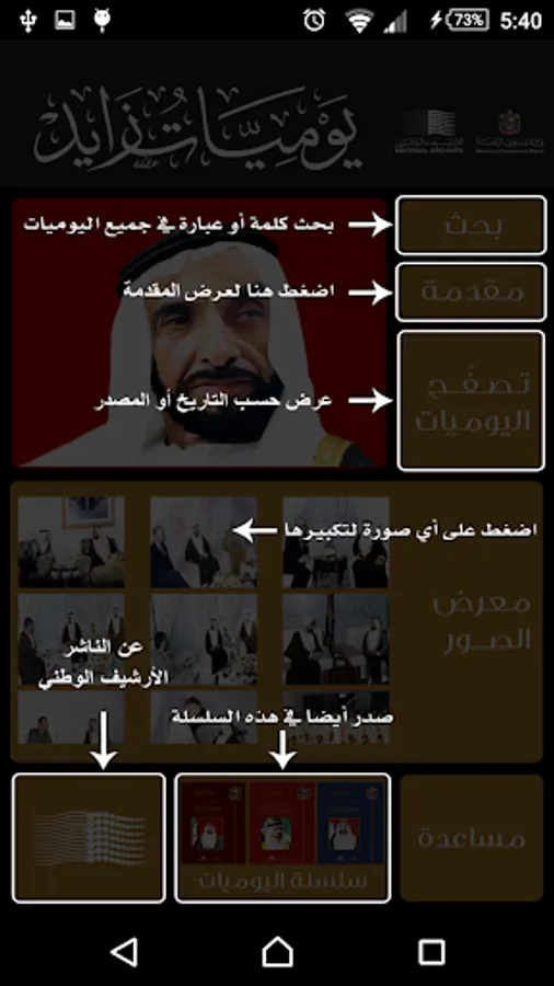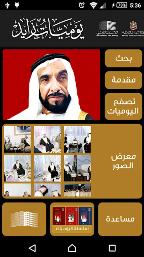 Application of daily events and activities of the late Sheikh Zayed bin Sultan Al Nahyan - has since 1966. Comprehensive different areas: social, economic, and media, and the security, political, and sports ... a fraction of his diary are derived which is published by the daily newspapers. Printed version of the book in eight volumes accompanied by a detailed catalog. This application can be a researcher or reader access to information accurately and as quickly as possible.