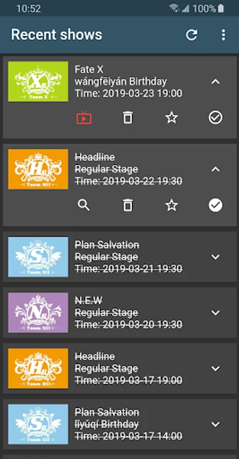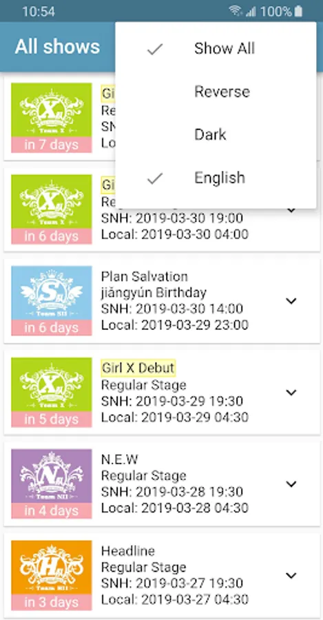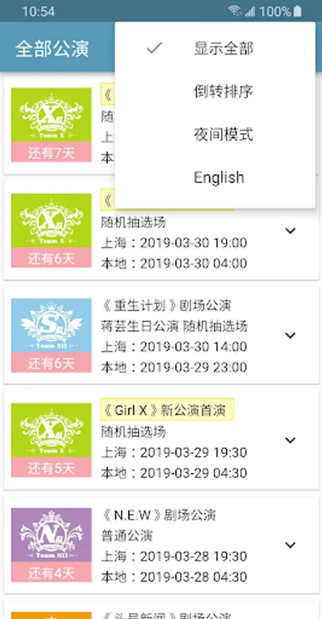 This is a fan-made utility app for fans to get information on show times, including upcoming and historical show information for each team. It has English translations and provides Local Time for upcoming shows in reference to Shanghai's timezone.
