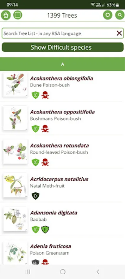 In Settings on the home screen, you can select your primary and secondary language choices from Scientific, English, or Afrikaans. In the Tree List you can search for a species by name, using any of the 11 South African languages.
