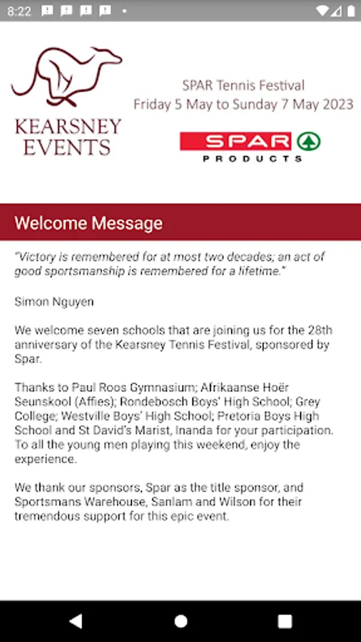 Kearsney College hosts a number of events and festivals each year, attracting visitors to its beautiful campus. Use this app to stay informed about our events and festivals so that you don't miss any of them. The annual Kearsney Rugby Festival (KERF) is our flagship event, attracting thousands of visitors from around the country who visit to support the participating . Keep watching our app for other events later in the year too.