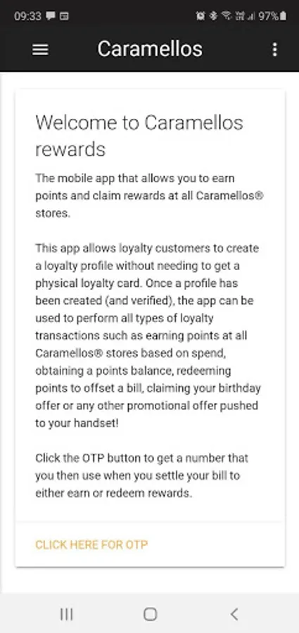 This app allows loyalty customers to create a loyalty profile without needing to get a physical loyalty card. Once a profile has been created (and verified), the app can be used to perform all types of loyalty transactions such as earning points at all Caramellos® stores based on spend, obtaining a points balance, redeeming points to offset a bill, claiming your birthday offer or any other promotional offer pushed to your handset!