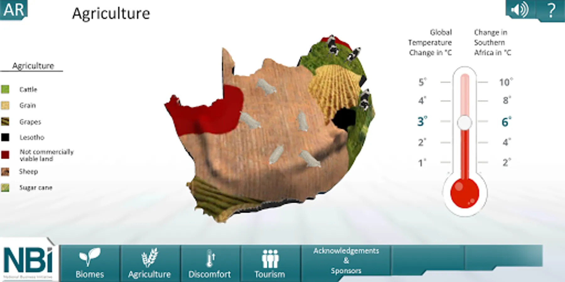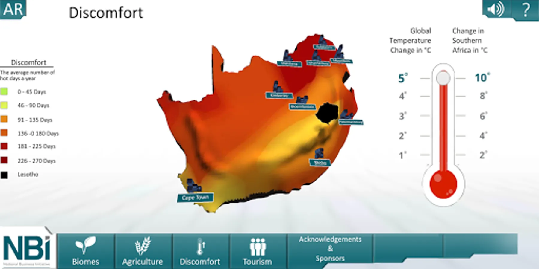 Users can choose to either experience the 3D version of the application or to download the marker and explore the Augmented Reality version. There are 3 Climate Change impacts that can be explored: the impact on ‘Biomes’, ‘Agriculture’ and ‘Discomfort’. In the ‘Biomes’ section, they can explore Virtual Reality renders of what each of the South African biomes look like as well as use the temperature slider to see how the spread of the biomes change across the country as temperatures increase. In the ‘Agriculture’ section, users can witness the effects of temperature increases on the crop and livestock viability across the country. The Discomfort section illustrates how increasing average temperatures will result in an increase in the number of hot days per year and the voiceover explains how this affects human well being. Finally, there is a ‘Tourism’ section that allows users to watch videos from some of South Africa’s most beautiful tourist destinations to illustrate the beauty of the country and inspire action to protect what we have while we still can.