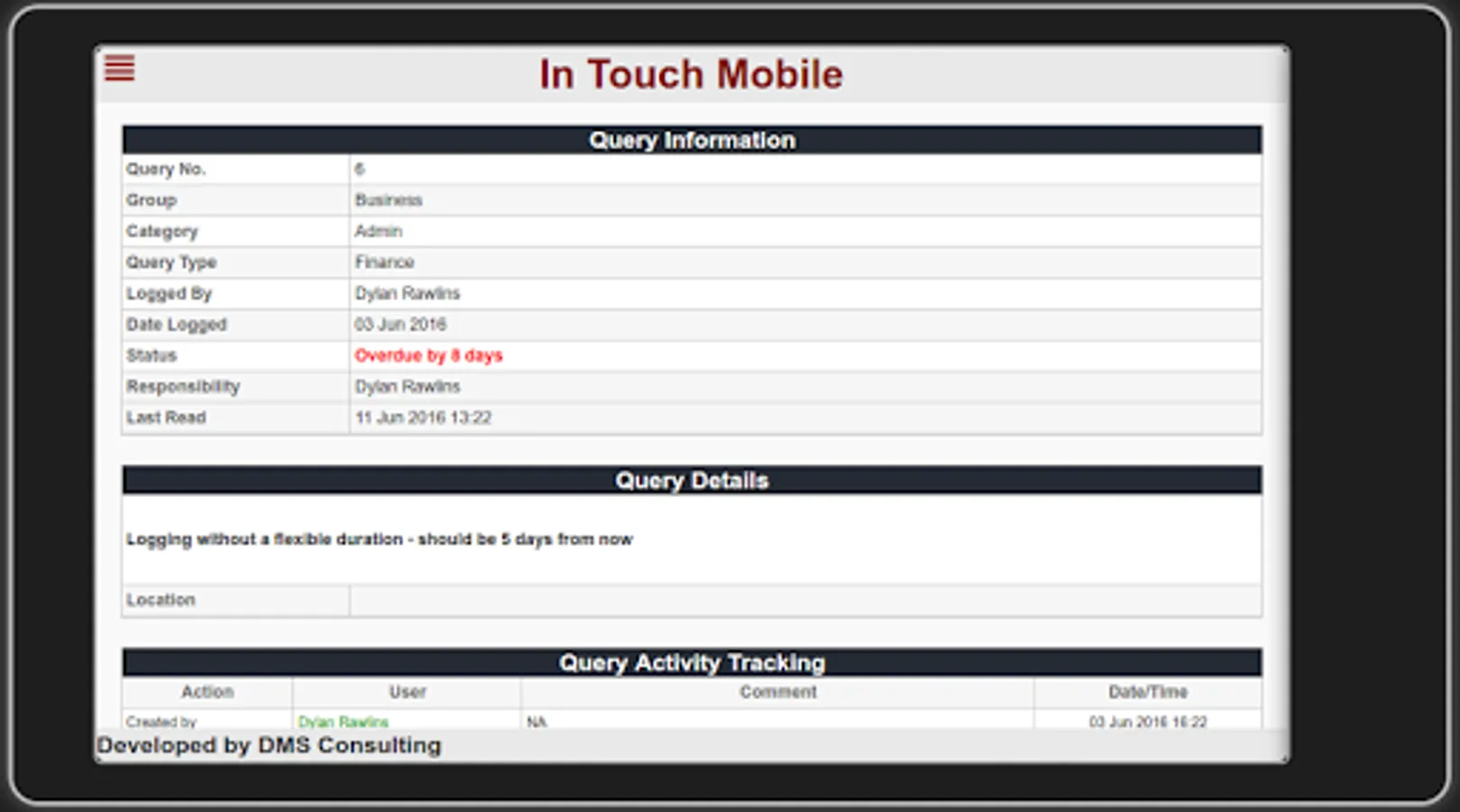 Managers can use InTouch to monitor high-level, as well as detailed, trends in Tasks as well as staff performance with regard to Task handling and resolution. InTouch uses automated push technology which emails information to users and managers, notifying them of any overdue Tasks within InTouch that require their attention.