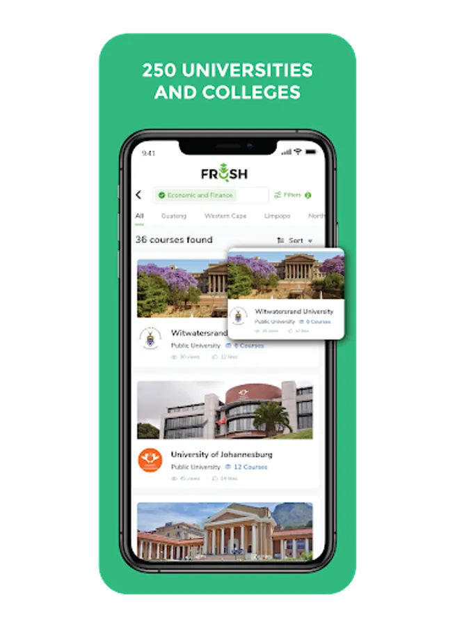 Enter your subjects and marks, then Frosh will calculate your APS score and subject requirements. Then it will show you where you qualify to study or which bursaries you qualify for, to then apply if you are in grade 12 or have completed school. Grade 9 learners use Frosh to help them choose the right subjects. Grade 10 & 11 learners use Frosh to help them understand how they need to perform academically to get admitted into universities and colleges. Grade 12s and those who have completed school use Frosh to help them see where they qualify and to apply.