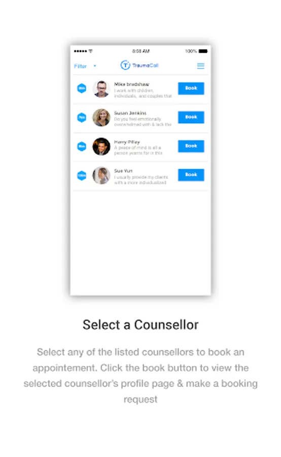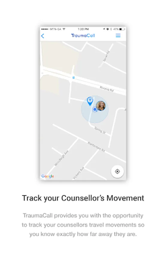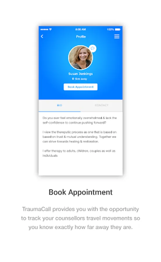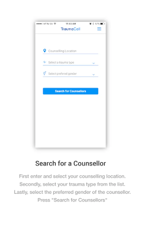 The TraumaCall app is a subscription based app that puts its members in touch with nearby counsellors in times of need. The app allows members to select counsellors based on expertise and proximity, giving the member access to help when it's needed the most.