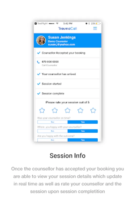 Counsellors services are rated within the app by members after counselling sessions have ended, giving other members the ability to choose from the best counsellors within their proximity.