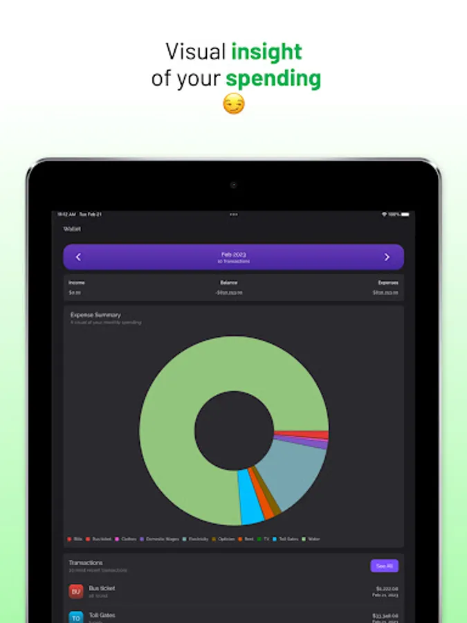 Take control of your finances with SpendWalley! Our easy-to-use interface allows you to record your expenses, categorize them, and view your spending habits in real-time. With our in-app subscriptions, you can unlock premium features such as multi-budget tracking and exporting of transaction to be used in popular tools like Excel, Numbers etc. With our App, all data is saved locally on your device, ensuring the privacy and security of your personal information. No need to worry about third-party servers or cloud storage! Our App also features biometric security, allowing you to protect your sensitive information with ease. Our App is designed to help you manage your money more efficiently and make informed financial decisions. Download now and start tracking your expenses today!