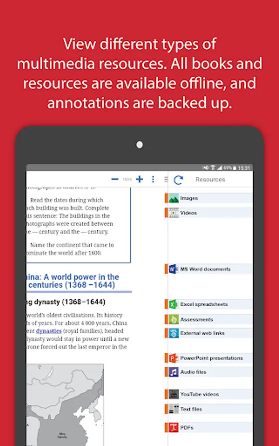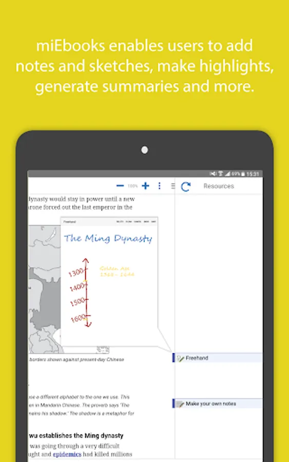 miEbooks, developed by ITSI, is an interactive e-reader that enhances users’ reading and studying experience. The app enables users to add notes and sketches to specific sections of an e-book, make highlights, generate summaries from highlighted text for study purposes, receive additional multimedia resources, and more. Once downloaded, all books and resources are available offline and annotations are backed-up whenever users connect to the Internet or Wi-Fi within their institution.