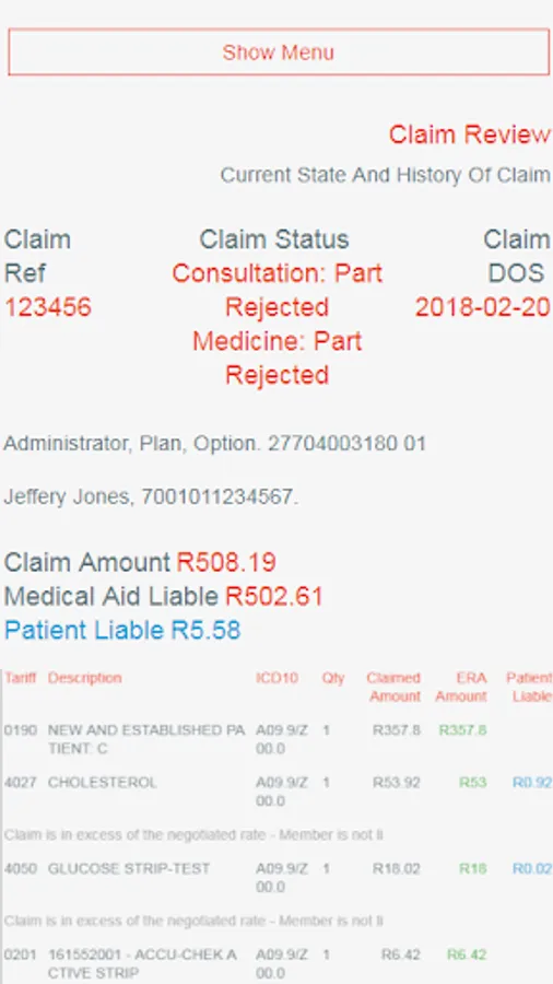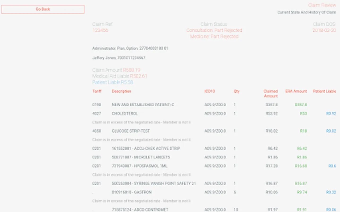 The financial overview also expands into the claimed items at line level giving an immediate insight into where Patient Liable deficits remain with clear line level Administrator rejections or warning response messages.