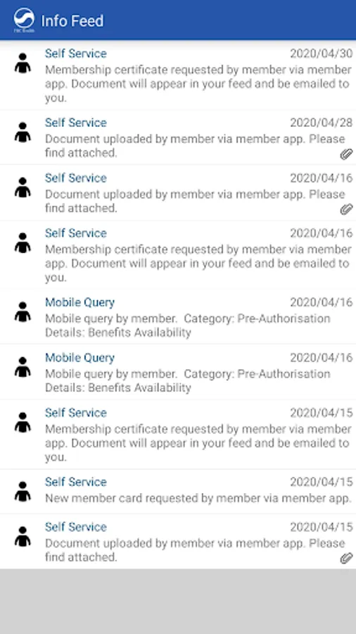 Information Feed: A list of all recent interactions between yourself and FBC Insurance including calls logged and recent use of benefits.