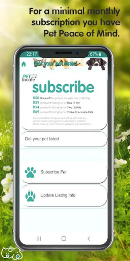 For a small monthly fee subscribe your pet or pets today! Each pet subscribed receives our Pet Tag with a QR Code, to scan from the Pet Locate App, for complete pet peace of mind.