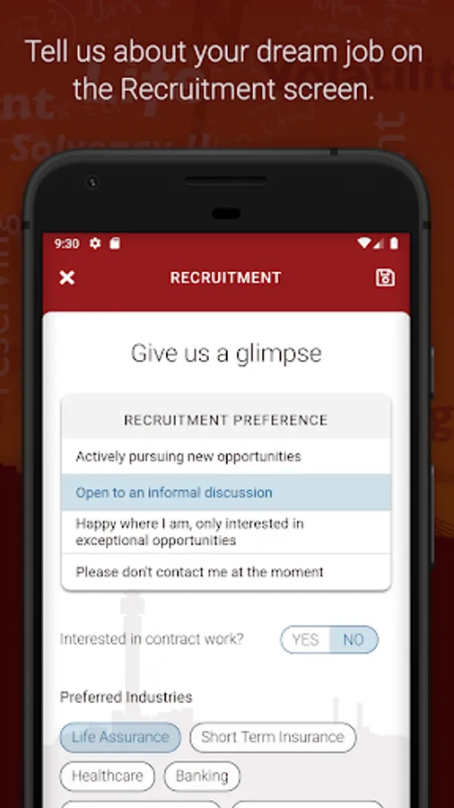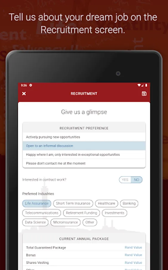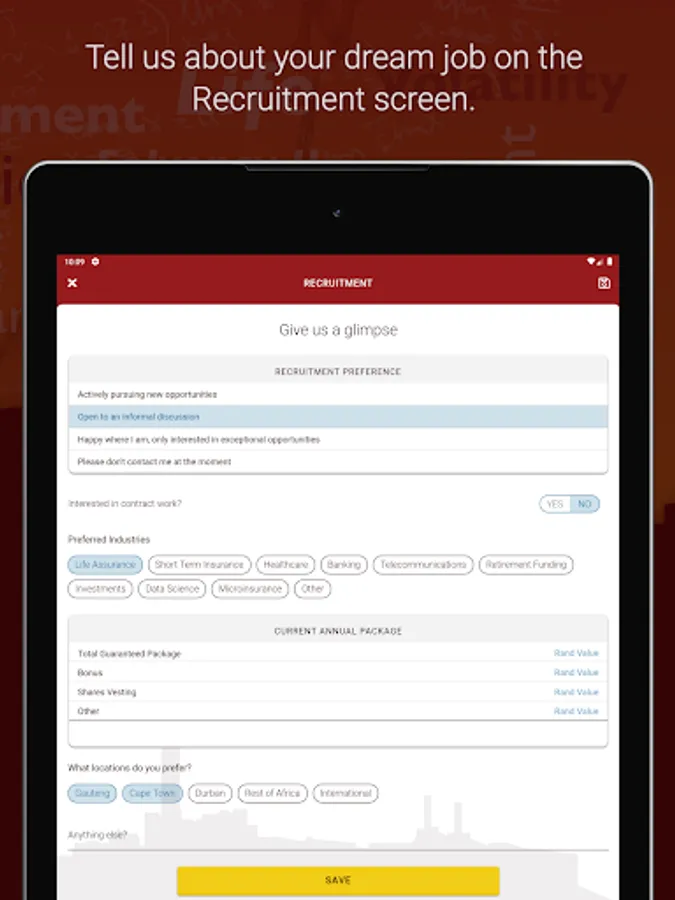 Recruitment: Set your recruitment preferences and your package details to let us know what type of career opportunities you would be interested in hearing about. This helps us to send you information about career opportunities that match your profile and preferences.