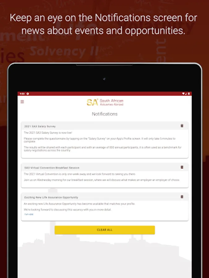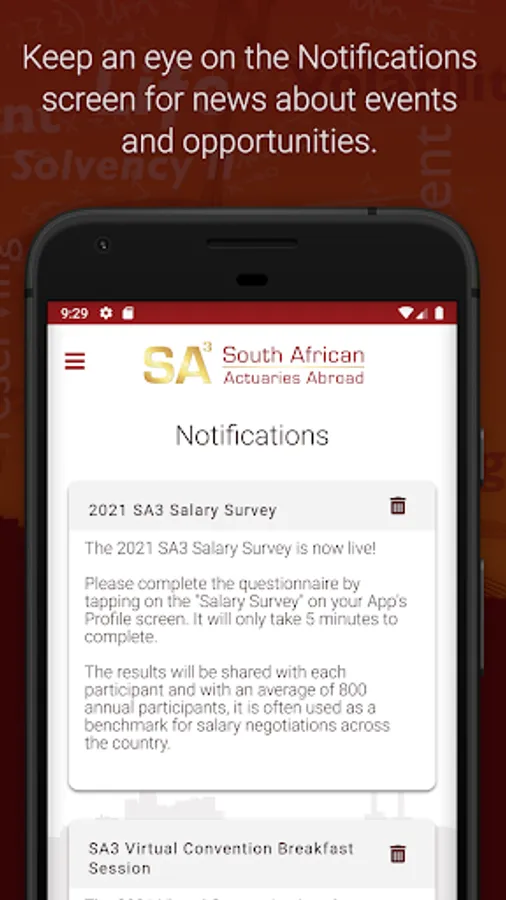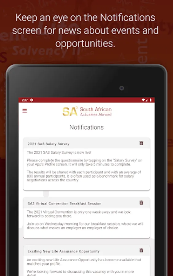 Salary Survey: You can now exclusively access the annual SA3 Salary Survey on the App. Participating in the survey is as easy as tapping on the “Salary Survey”-tile and answering a few quick questions. The results will be shared with each participant and with an average of 800 annual participants, it is often used as a benchmark for salary negotiations across the country.