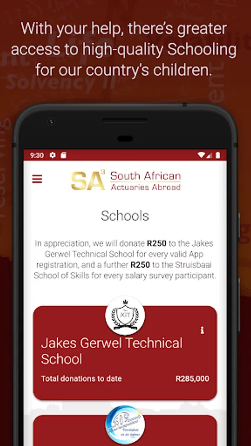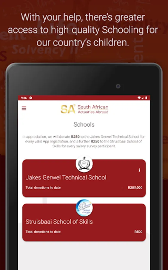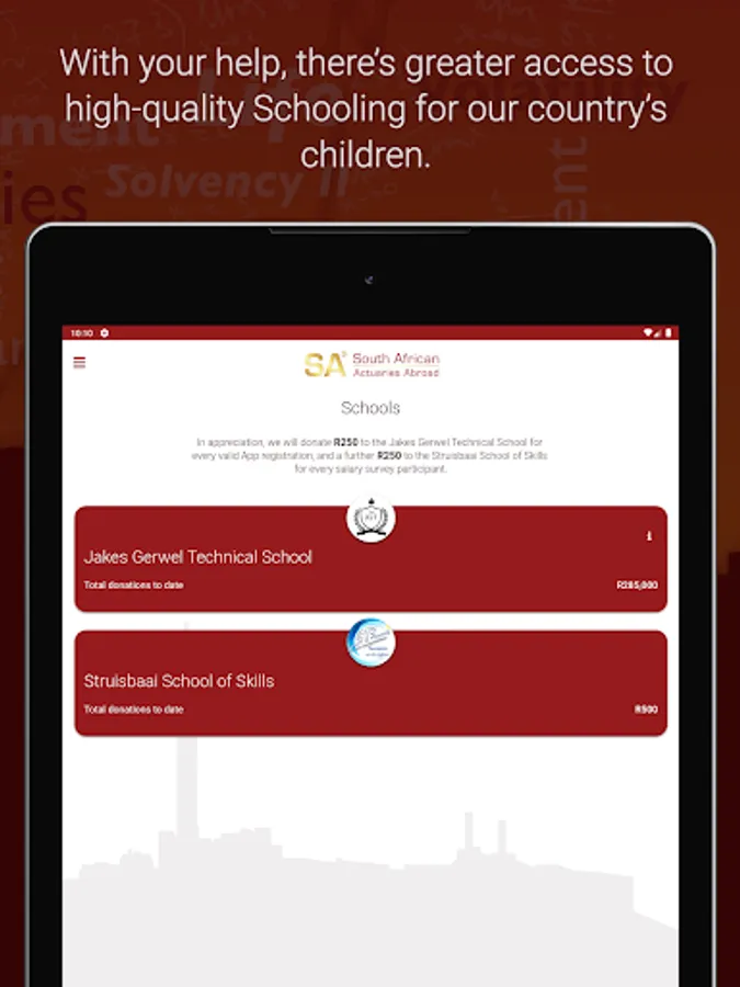 You can now serve as an agent of change by opening the Schools-tab. Your App registration and participation in our Salary Survey contributes to greater access to high-quality schooling for our country’s children.