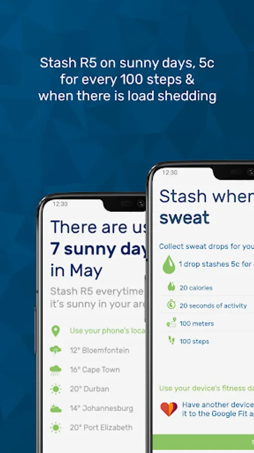 Save on sunny days for your rainy day. Every day, Stash checks the weather in your area. If it's sunny, you stash spare change. If it's un-sunny, you don't.