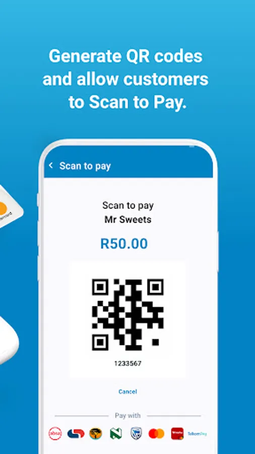 • Generate QR codes for customers to scan and pay with their bank enable app or any Scan to Pay by Masterpass app.