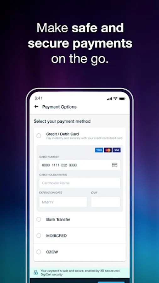 Choose from multiple payment options, including credit or debit card, EFT, Mobicred, and Discovery Miles