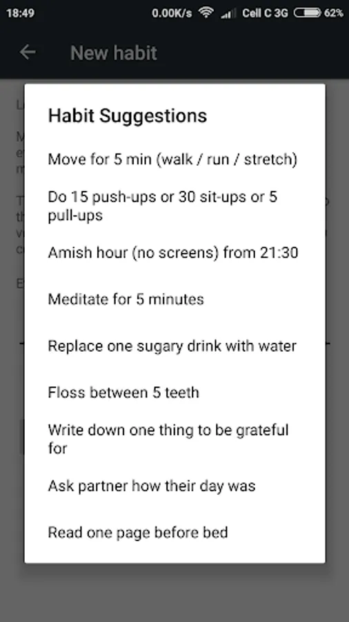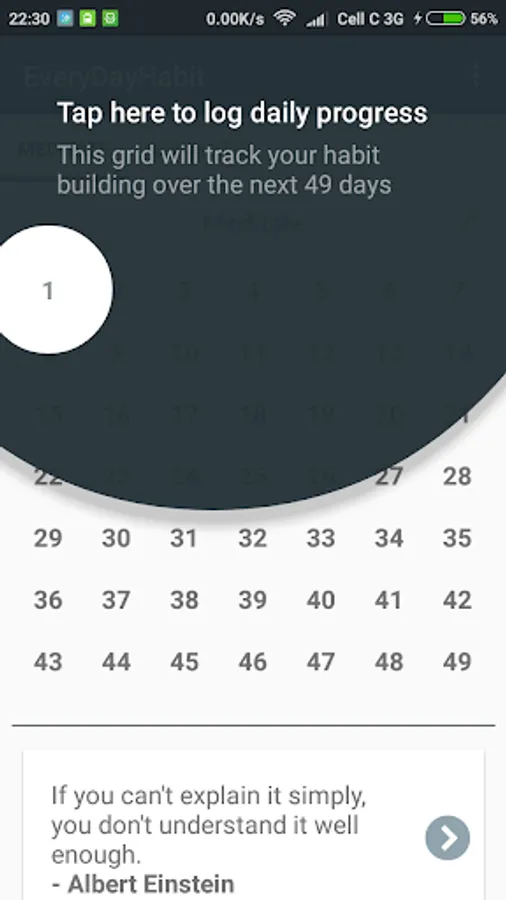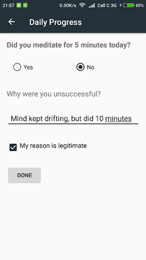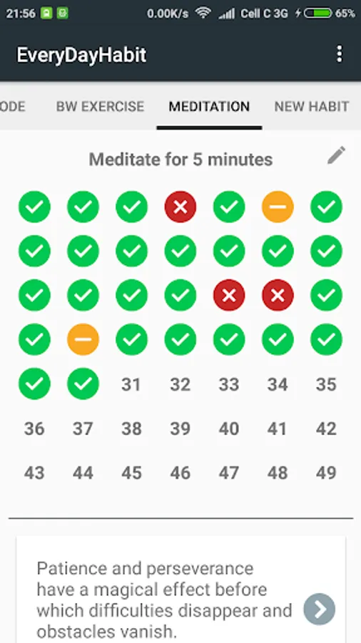 Keep a habit diary with EveryDayHabit where you indicate how much you did each day, or why you didn't perform the desired habit. Habit check marks indicate successful days. The app also offers an option to mark legitimately missed days so that your habit stats don't get ruined if illness or circumstances renders you unable to maintain a habit streak.