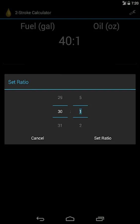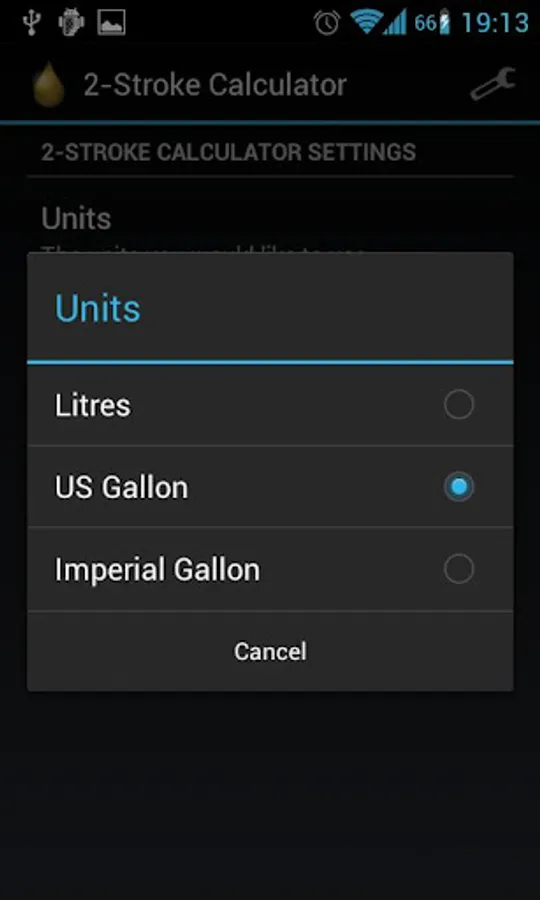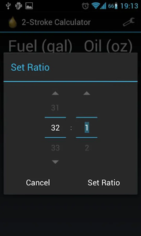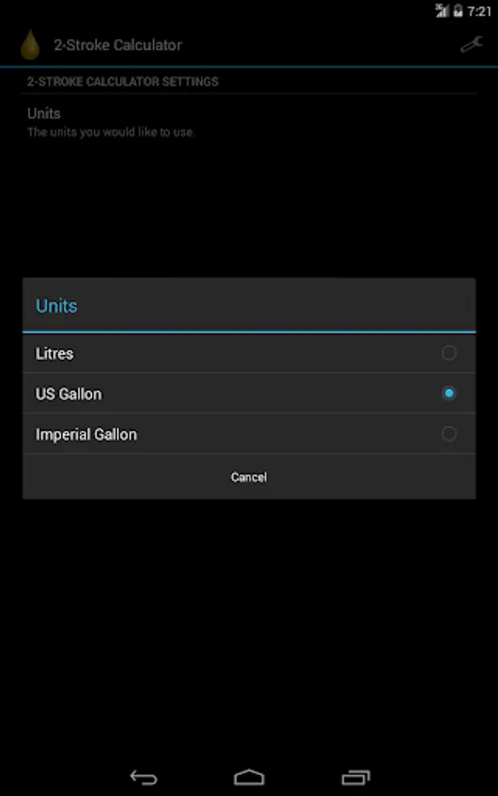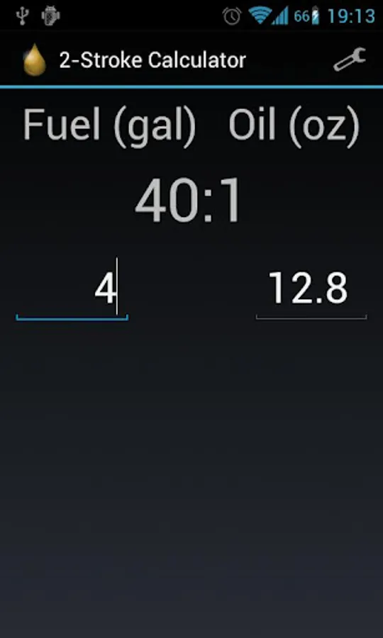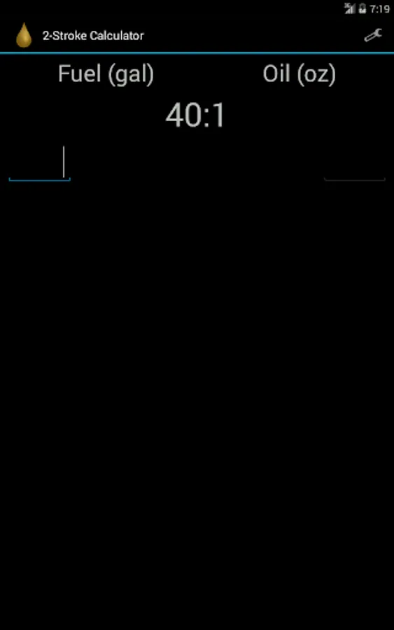 Supports US Gallon, Imperial Gallon and Litre ratio calculations. Touch the on screen ratio to change it. Ad-free and no permissions required.