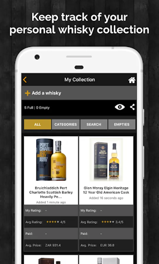 Save your favourite whiskies, rate them, share your ratings and new finds on social media and create public or private tasting notes.