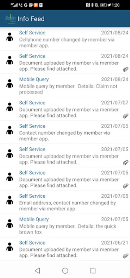 Information Feed: A list of all recent interactions between yourself or your membership and Maisha Health Fund. Including records of interactions with contact centre agents, recent statements.