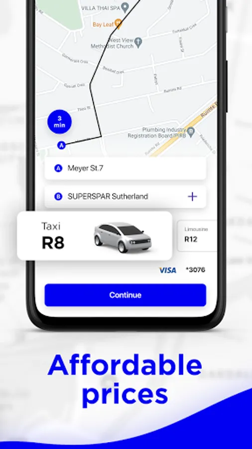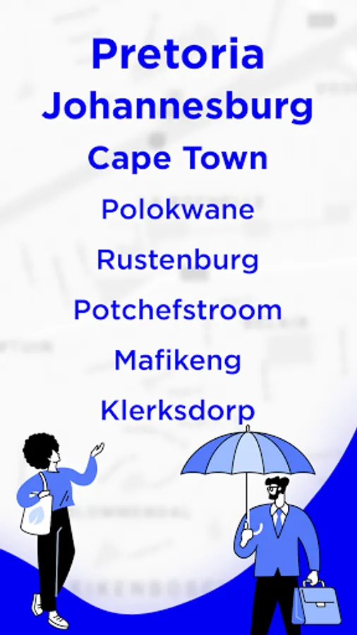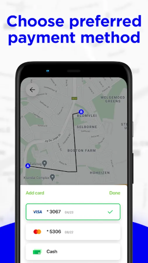 Get upfront pricing before a trip. - Once you confirm your trip, you will be matched with a nearby driver. You can check driver's name, car model and license plate number. All our drivers are certified for rides in South Africa; in Johannesburg, Pretoria, Cape Town, Polokwane, Durban and Mbombela and other areas in particular.