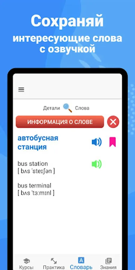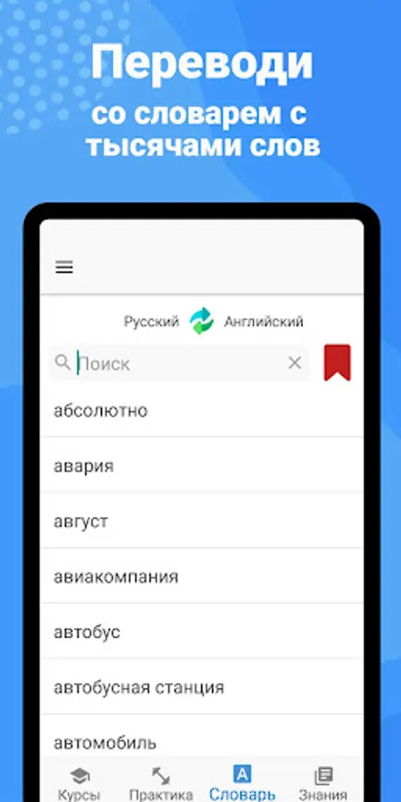 ► The app already has over 10,000 English words in the dictionary. You can also search, save and listen to words in English. In the application you will find English words for any level of English;