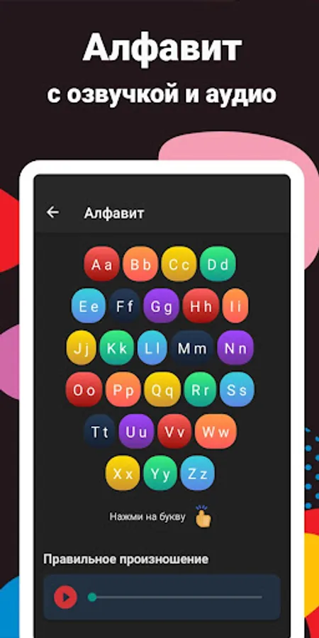 ► a detailed, interactive alphabet of the English language with voice acting and audio will help both an adult and a child to easily and interestingly learn the basics of the English language;