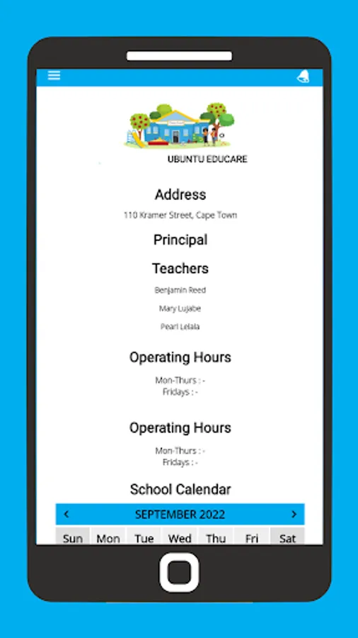 My Child's ECD Centre: you are able to view the ECD Centre's address, principal name and contact number, teachers' names, operating hours and school calendar.