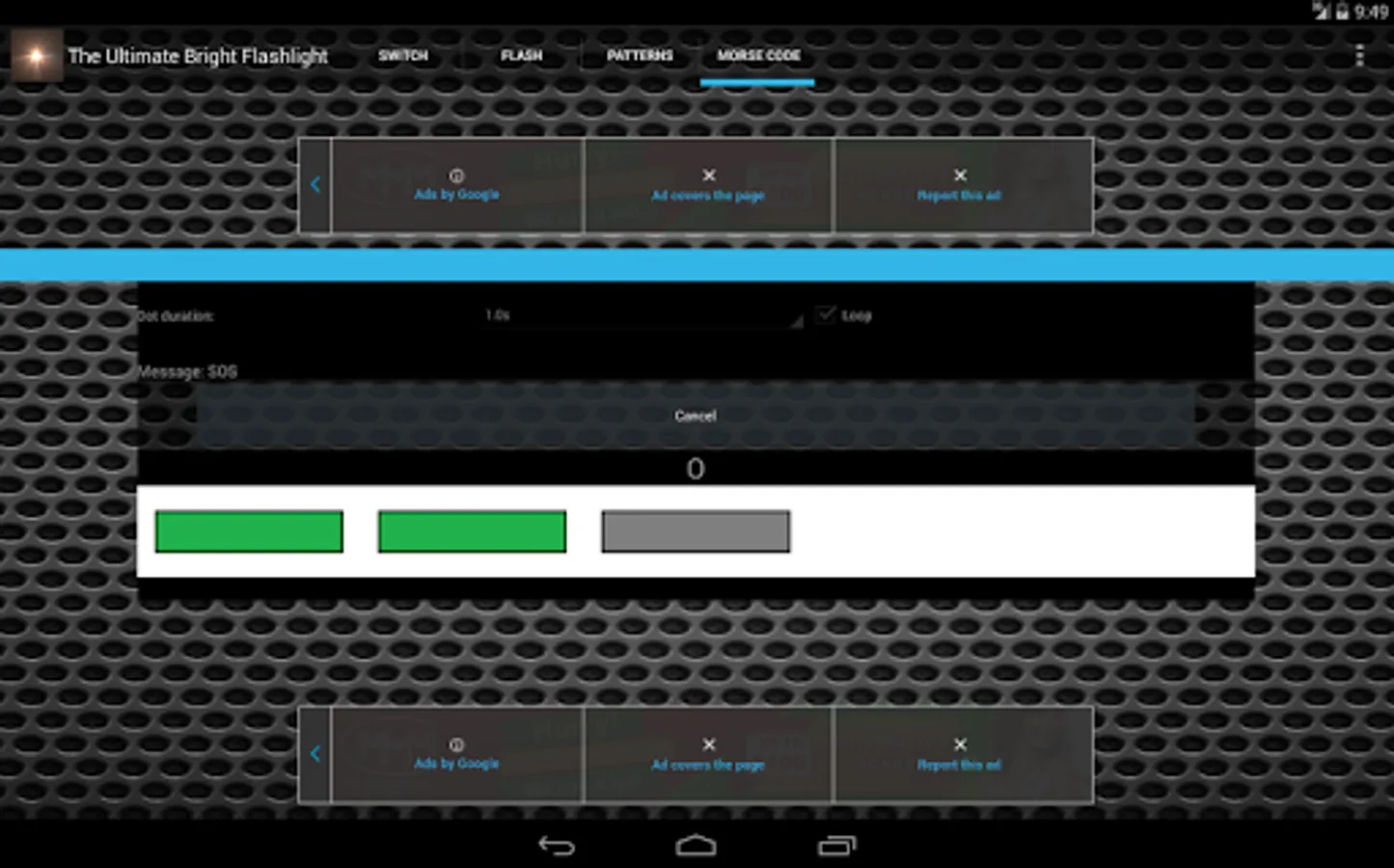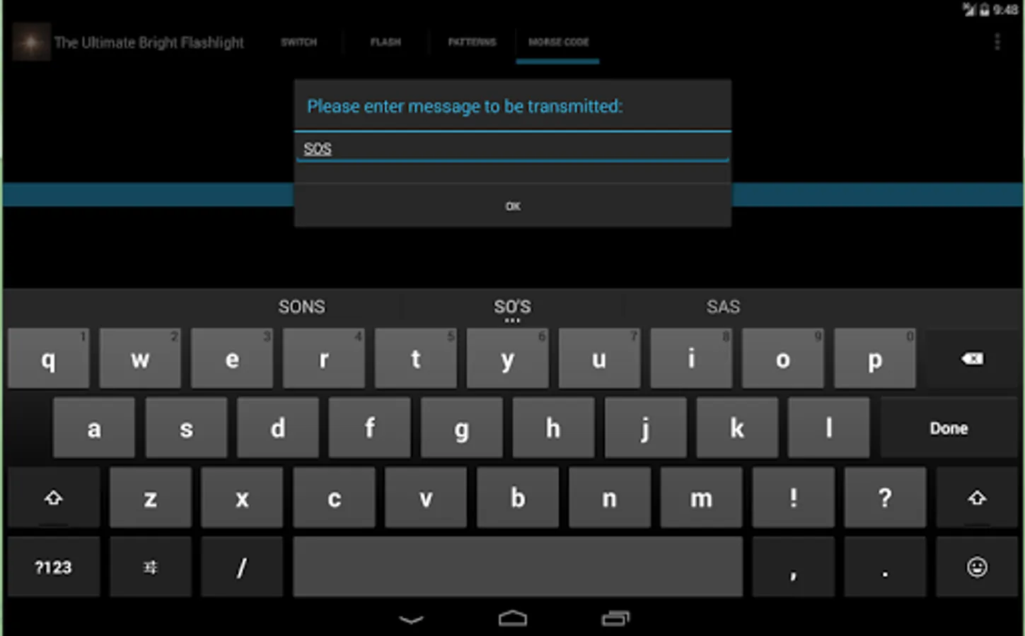 - Morse mode: enter a message and transmit it in Morse Code (using the Flashlight). This mode also allows you to control the speed at which the message is transmitted and whether or not the transmission is looped.