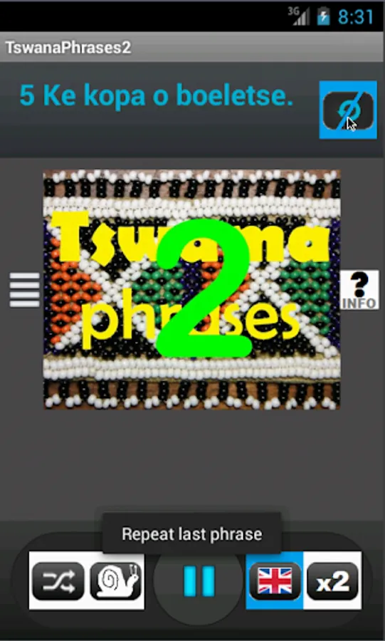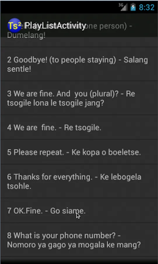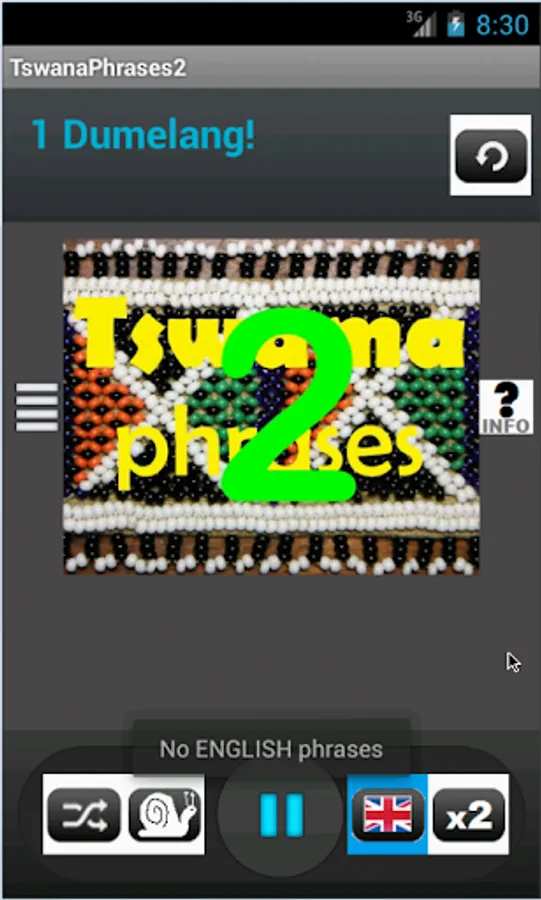 TswanaPhrases2 is a simple yet useful and completely free Android app that plays about 35 frequently used Tswana (seTswana) conversational phrases with their English translations on your Android phone. This is a sequel to TswanaPhrases1. If you master these phrases, you should be able to delight and “click” with Tswana speakers. The app cycles (random/sequentially) through the various phrases, and you can lengthen the pauses inbetween sentences in case you want to practice them out loud or need more time. You can switch off the English translations so that you can just listen to the Tswana phrases playing back, if you are commuting or waiting to see the bank manager! Also options for repeat/single play; long/short pauses and random/sequential play.