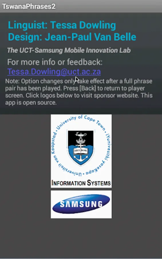 This app was built in the interest of getting South Africans to talk to each other but can be used by anyone interested in learning some basic Tswana phrases. Compact. Easy-to-use. Supplements the phrases from the popular TswanaPhrases1. This app was developed by the University of Cape Town’s Samsung Mobile Innovation Lab as a collaboration between Tessa Dowling, African Languages and Jean-Paul Van Belle from the Information Systems Department. Also available in four other South African languages. Find all our apps on: https://play.google.com/store/apps/developer?id=Information+Systems+Dept+-+University+of+Cape+Town