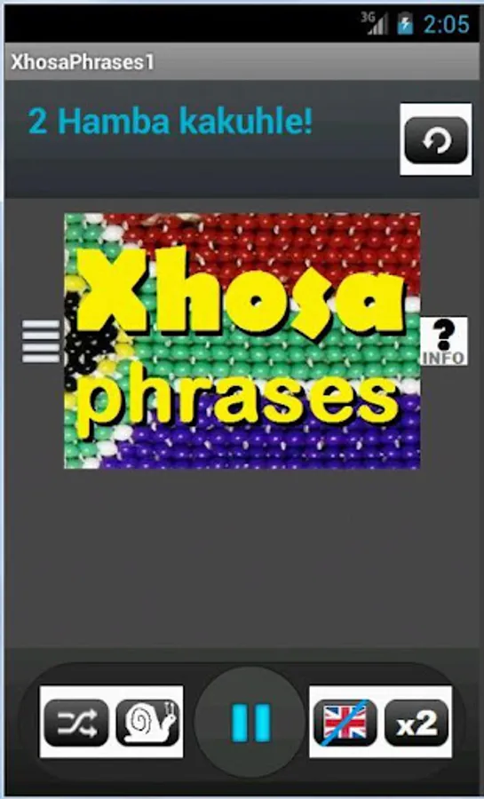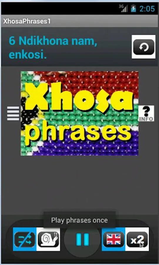 Xhosa Phrases is a simple yet useful and completely free Android app that plays about forty frequently used Xhosa (or isiXhosa) conversational phrases with their English translations on your Android phone. If you master these phrases, you should be able to delight and “click” with Xhosa speakers. The app cycles (random/sequentially) through the various phrases, and you can lengthen the pauses inbetween sentences in case you want to practice them out loud or need more time. You can switch off the English translations so that you can just listen to the Xhosa phrases playing back, if you are commuting or waiting to see the bank manager! Also options for repeat/single play; long/short pauses and random/sequential play.