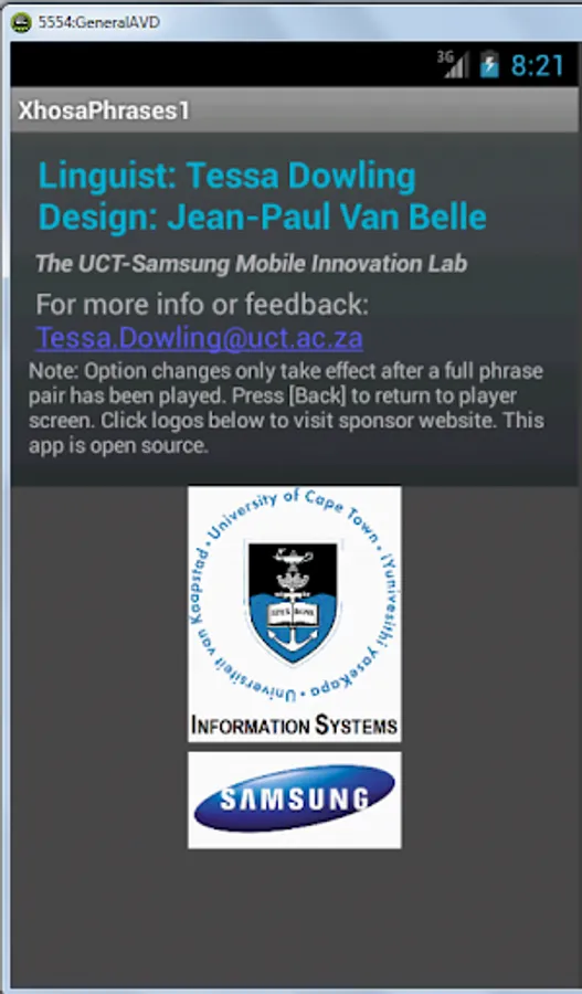 This app was built in the interest of getting South Africans to talk to each other but can be used by anyone interested in learning some basic Xhosa phrases. Compact. Easy-to-use. This app was developed by the University of Cape Town’s Samsung Mobile Innovation Lab as a collaboration between Tessa Dowling, African Languages and Jean-Paul Van Belle from the Information Systems Department. Also available in four other South African languages. XhosaPhrases2 has more fun phrases for you to master with just a tap of your cell! Find all our apps on: https://play.google.com/store/apps/developer?id=Information+Systems+Dept+-+University+of+Cape+Town.