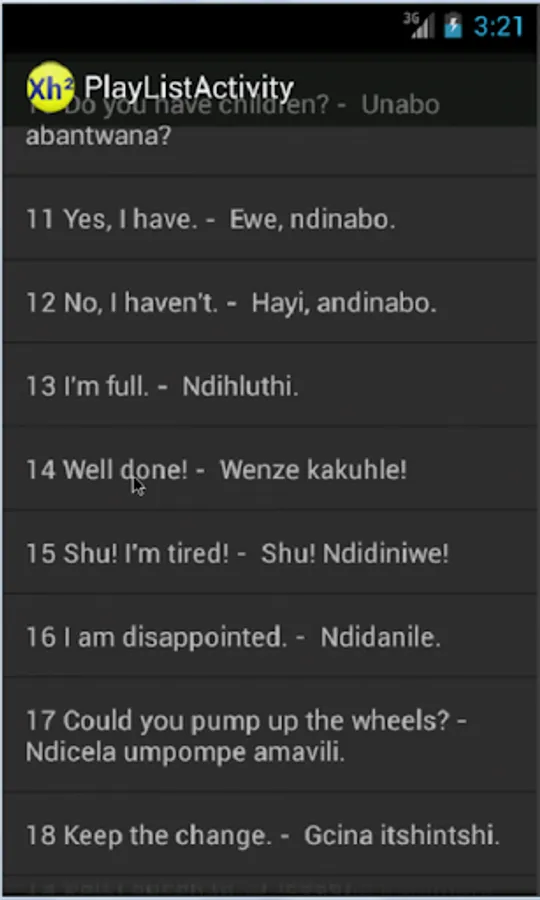 XhosaPhrases2 is a simple yet useful and completely free Android app that plays about 35 frequently used Xhosa (or isiXhosa) conversational phrases with their English translations on your Android phone. It is a sequel to XhosaPhrases1. If you master these phrases, you should be able to delight and “click” with Xhosa speakers. The app cycles (random/sequentially) through the various phrases, and you can lengthen the pauses inbetween sentences in case you want to practice them out loud or need more time. You can switch off the English translations so that you can just listen to the Xhosa phrases playing back, if you are commuting or waiting to see the bank manager! Also options for repeat/single play; long/short pauses and random/sequential play.