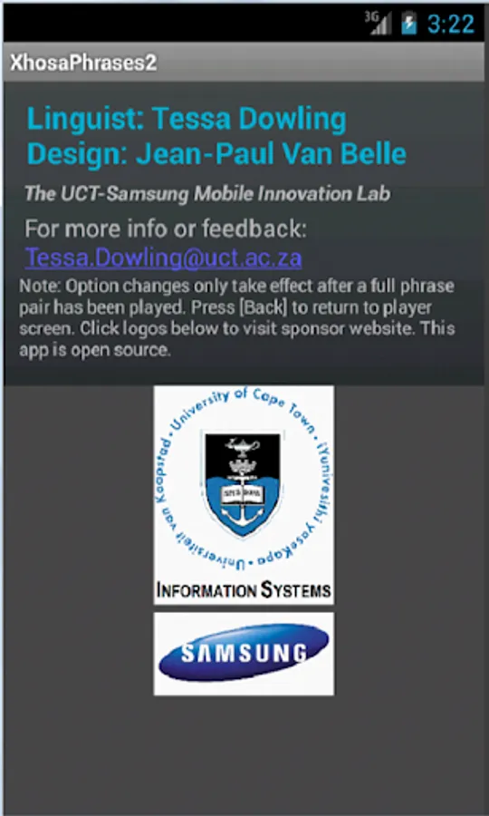 This app was built in the interest of getting South Africans to talk to each other but can be used by anyone interested in learning some basic Xhosa phrases. Compact. Easy-to-use. Supplements the phrases from the popular XhosaPhrases1. This app was developed by the University of Cape Town’s Samsung Mobile Innovation Lab as a collaboration between Tessa Dowling, African Languages and Jean-Paul Van Belle from the Information Systems Department. Also available in four other South African languages. Find all our apps on: https://play.google.com/store/apps/developer?id=Information+Systems+Dept+-+University+of+Cape+Town .