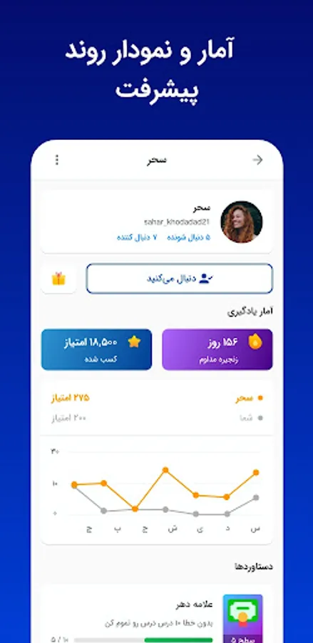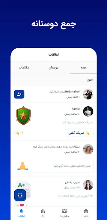 Zambamoz is the first Iranian application that has designed an attractive league for language learning. You compete with other people in this league and this makes you highly motivated to improve. By getting the necessary points, you will enter higher level leagues and compete with more professional people! You can follow your friends like on social networks and sing to each other again!