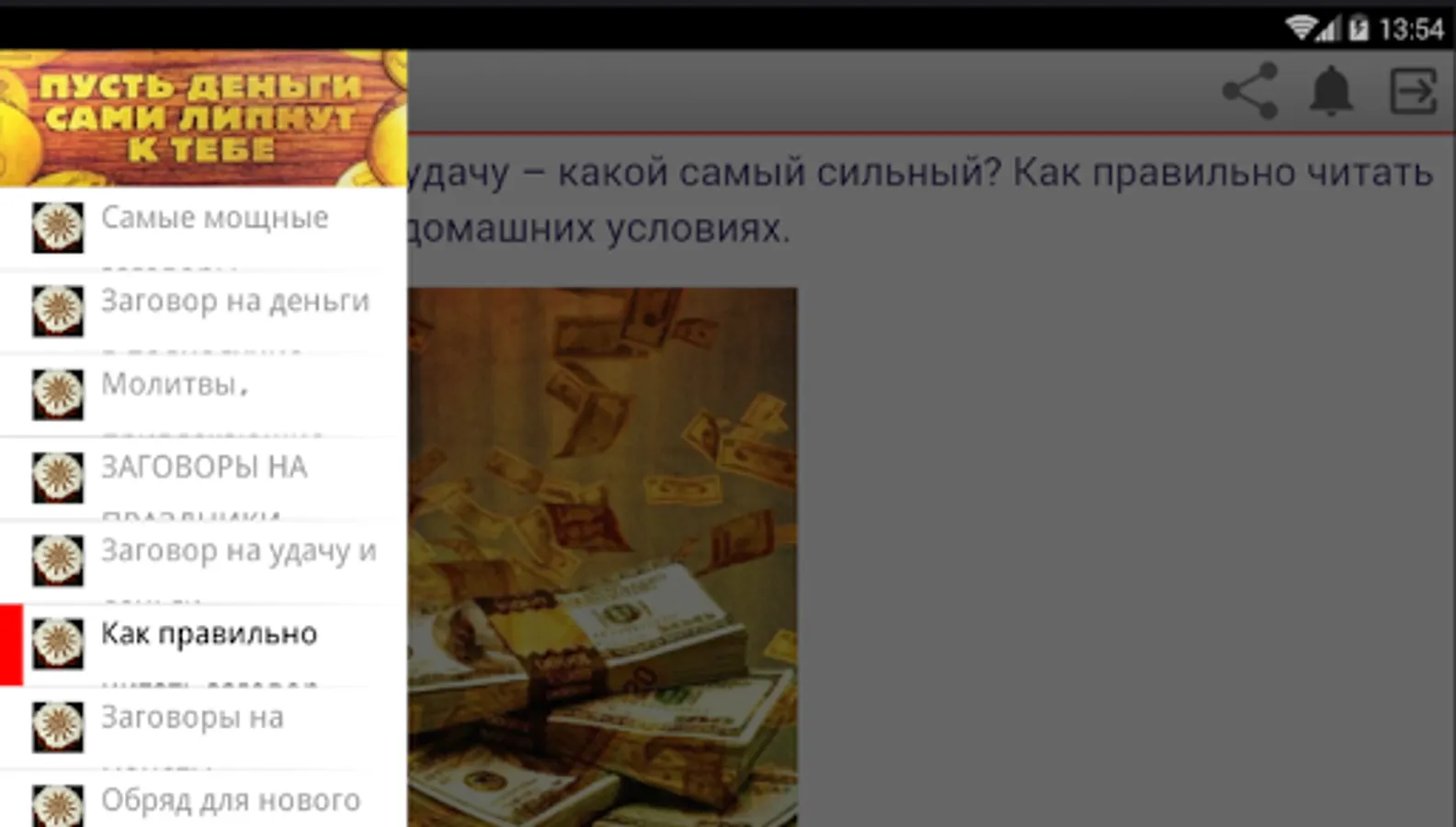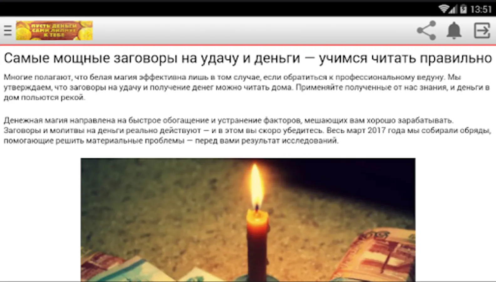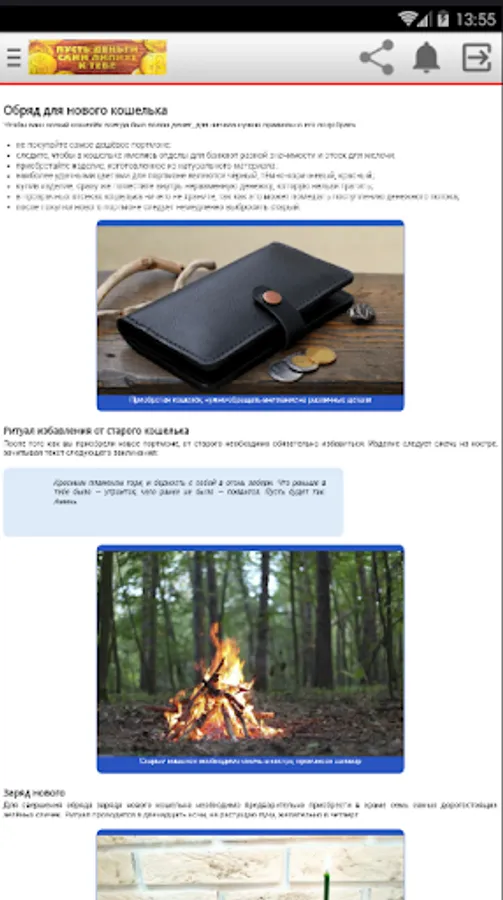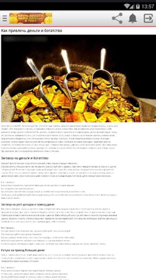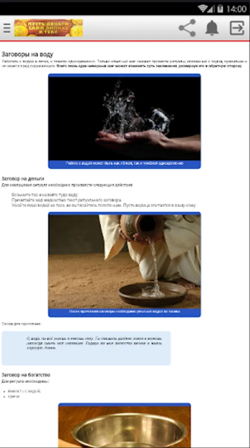 The application "Money Conspiracies" offers various money plots and describes in detail how money rituals should be carried out. In it, you will learn what kind of money talismans you need to have in order to always live in prosperity. You will find spells for money suitable for a particular situation. You just have to choose the right money spells, conduct the ceremony correctly and believe that the magic of money and wealth works. The result will not make you wait long: spells for good luck will establish an atmosphere of financial well-being in the house and eliminate problems in this area.