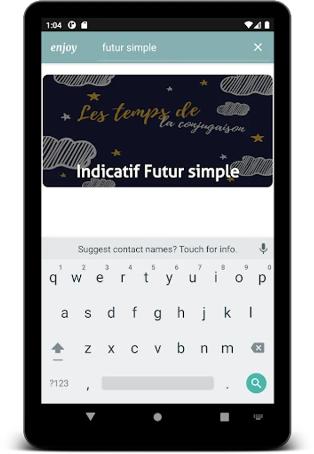 * French conjugation guide (without internet) allows you to conjugate French verbs in all modes, all tenses and all forms: passive voice, pronominal voice, negative form, interrogative form, feminine conjugation ... etc.