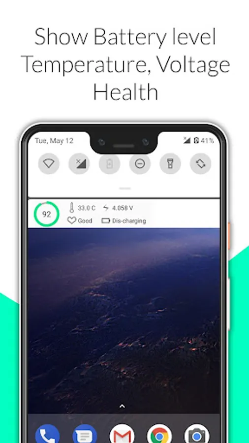 ✔ Expanded Notification show Battery Percentage(with a circular progress), Status(Charging, Dis-Charging...), Temperature, Voltage and Health