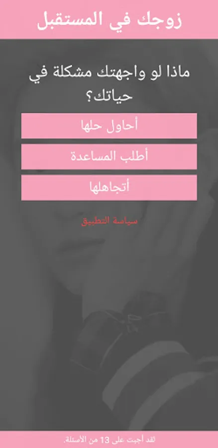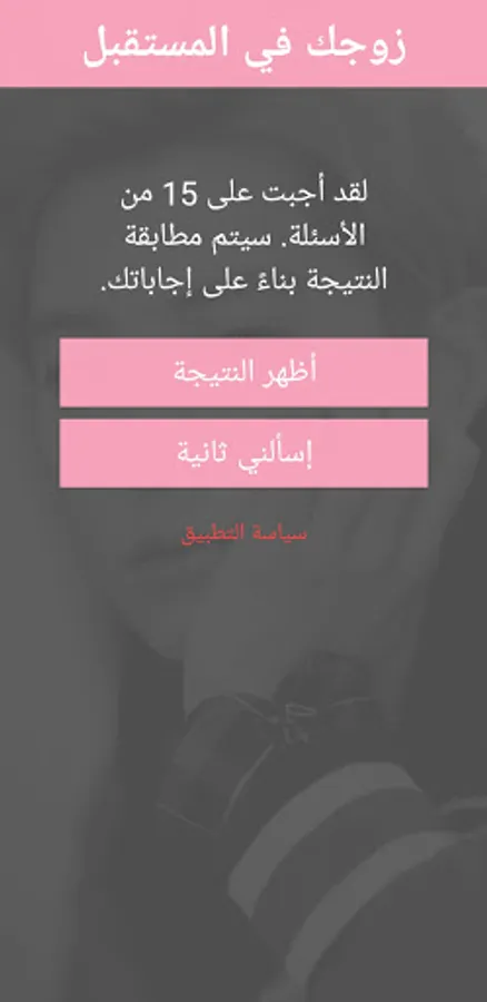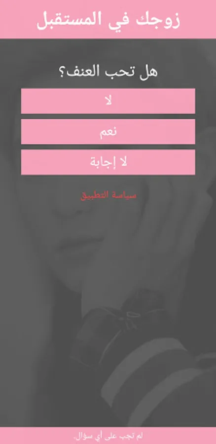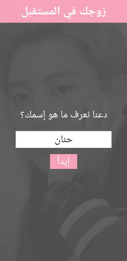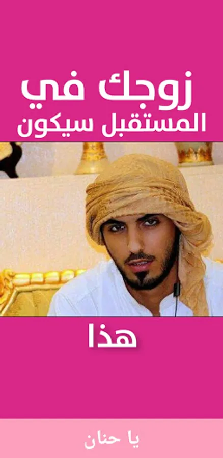 An application to know the shape of your future husband, it is an application that is intended for entertainment and entertainment, where the user answers the questions raised in the application, and in return the result will be in the form of your future husband, I hope but enjoy using the application, you can also download similar applications, such as: Of Arab celebrities, and the shape of your future home, and the shape of your future wife.